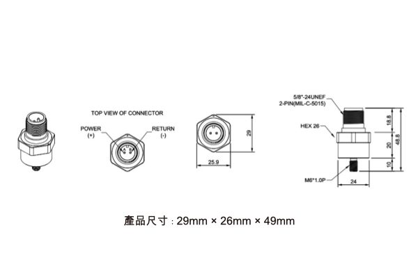- 尺寸(未含軍規接頭):直徑(最大寬): 29.0mm,高: 48.8mm(不含纜線)